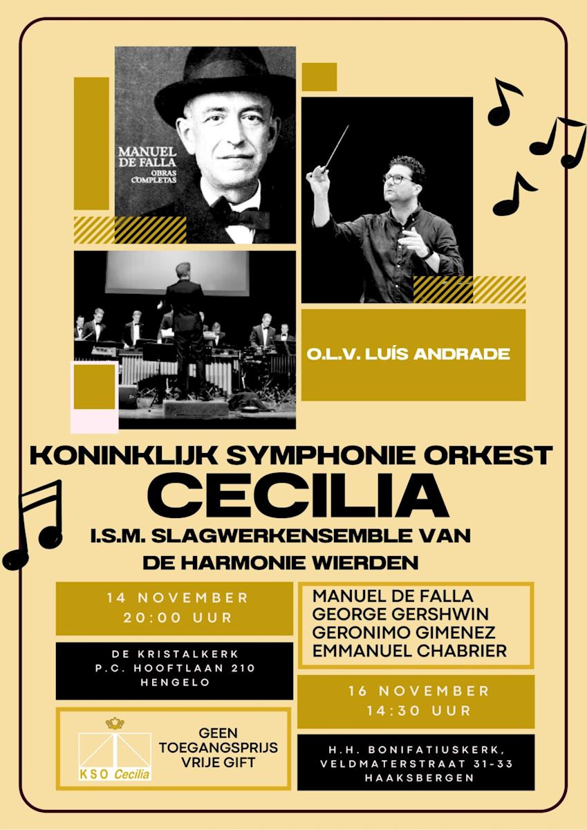 Het Koninklijk Symphonie Orkest Cecilia uit Hengelo geeft o.l.v. dirigent Luís Andrade, op vrijdag 14 november in de Kristalkerk te Hengelo en