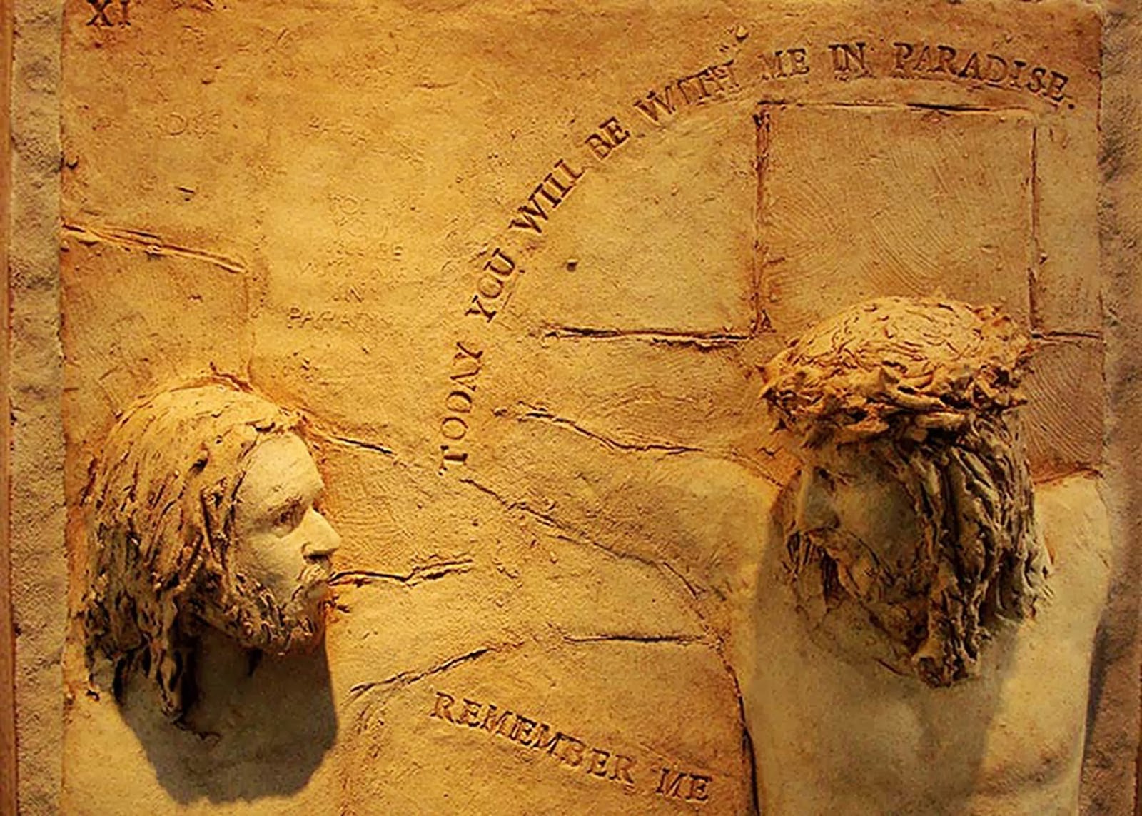 Tegelijk met Jezus worden twee andere mannen gekruisigd. Eén van hen heeft door dat hij zichzelf niet kan redden. De aanblik van de gekruisigde Jezus – “Hij heeft niets verkeerds gedaan” – vervult hem met ontzag voor God en hij erkent dat hij in zijn leven fouten heeft gemaakt. Hij vraagt Jezus om aan hem te denken, om zich over hem te ontfermen. “Vandaag nog,” zegt Jezus, “vandaag nog zul je gered worden.”