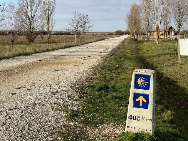 De Meseta, een 170km stuk vlak hoogland zonder hindernissen op de horizon doet me stap voor stap uithouden en bezinnen. Ik geniet nog steeds maar kan ook al een beetje naar het einde verlangen. En dat einde nadert van 600 naar 500 naar 400 km.