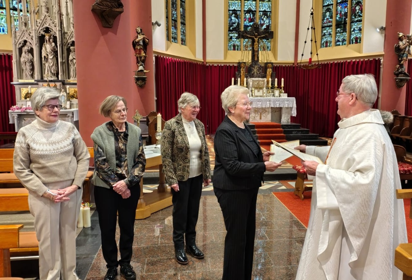 Aansluitend op de eucharistieviering, waar verscheidene familieleden van de jubilarissen aanwezig waren, vroeg parochievicaris Willy Rekveld aan Riet Kalter, Annette Fleer (beiden 40 jaar lid), Els van der Zalm en Marietje Viscer (25-jarig lidmaatschap) om naar voren te komen.